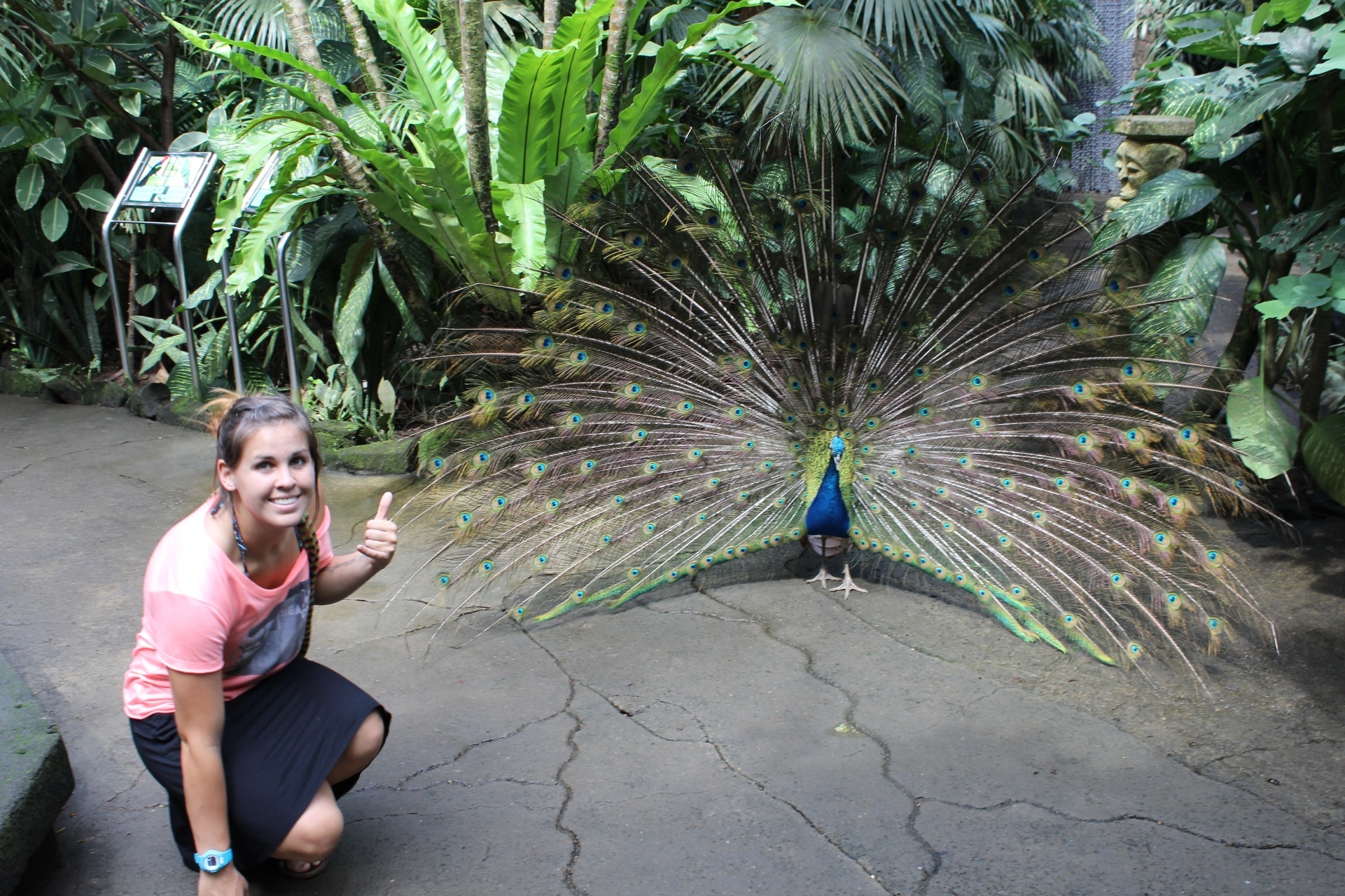 We found ourselves alone in one of the several unrivaled aviaries, and were quickly accosted by a five-bird flock of peacocks. The first ran across our feet, while the last – I’m assuming the alpha male – opened his beautiful wings for us. He turned right at us and shook his feathers, as if posing for the perfect, once-in-a-lifetime picture. He even allowed us to crouch down next to him, and stared at us blankly. We have peacocks in Hawaii, and I’ve seen them running freely around the San Diego Zoo, but I have never seen one with feathers bared a mere six inches from my feet. It was astounding.