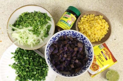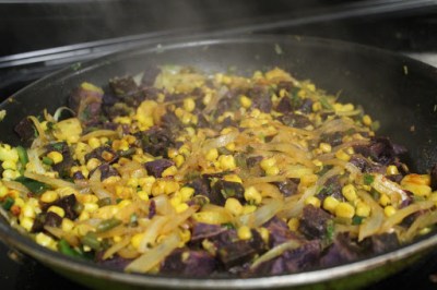 Cook until the onions start to sweat; next, add the corn, sliced pineapple and sweet potatoes. Continue to pour in either water or beer to a gentle simmer. Continually add in seasonings and squeeze lemon lime to taste. After about 10 minutes, place the veggies in a bowl.