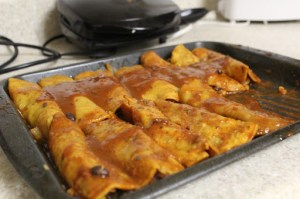 Take each drenched tortilla, drop it in the pan, and fill it with a scoop of black beans and a scoop of veggies. Roll tightly and place in a row.