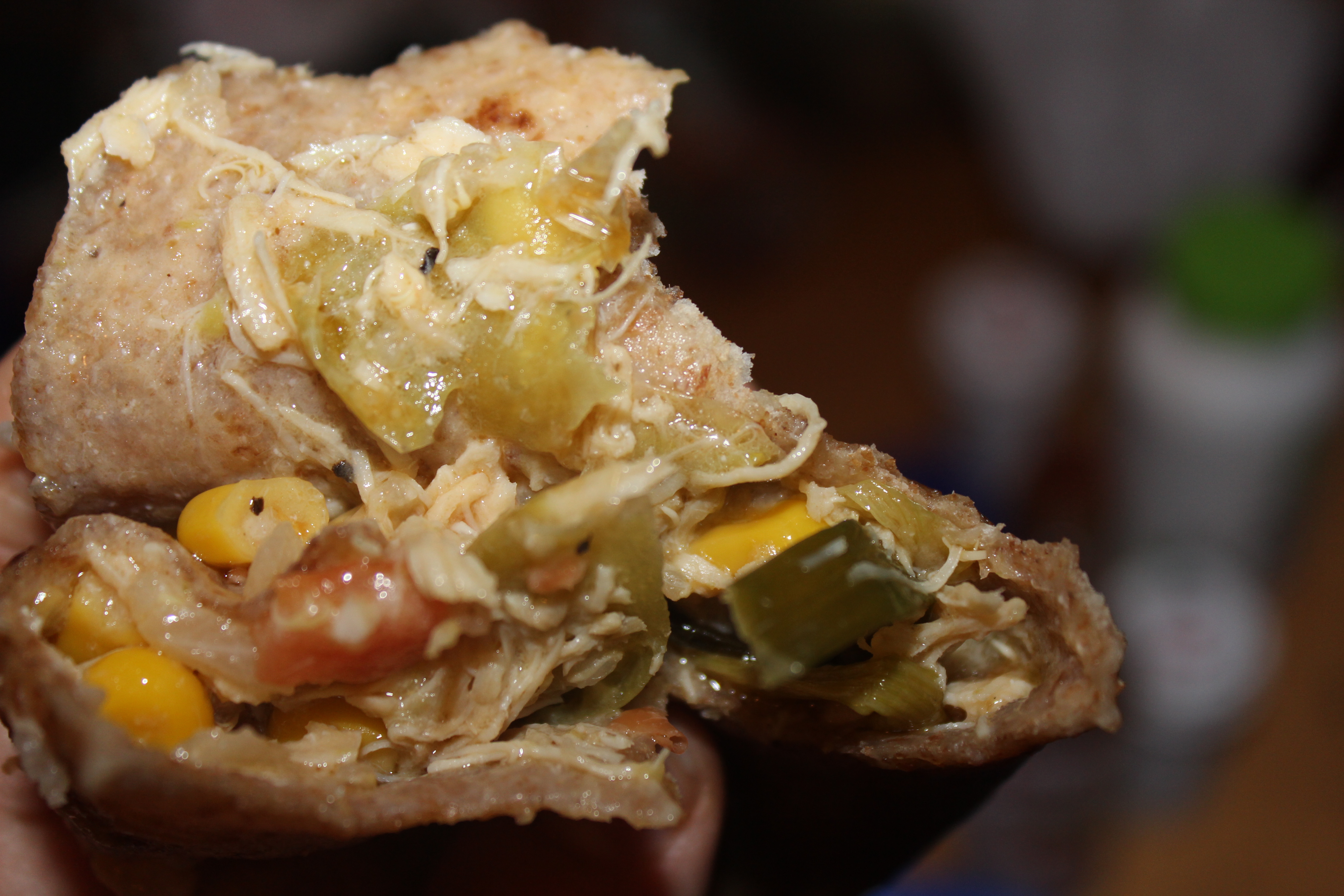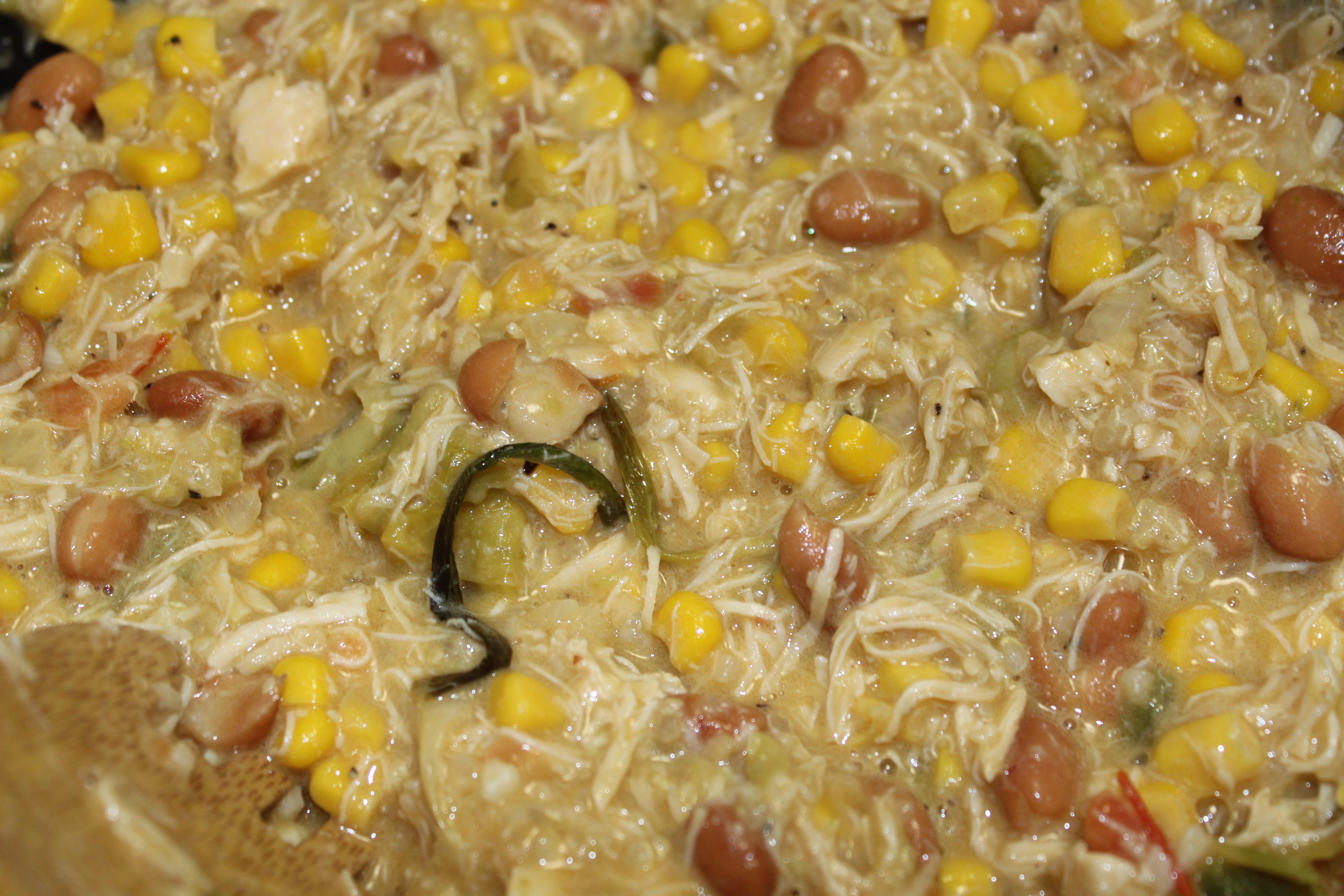 What he made was a kind of stew, made from tomatillos, corn, tomatoes, onions, pinto beans, green onions, minced garlic, a single jalepeno pepper and some shredded chicken all fried in sesame oil. Now, I try my darndest to avoid animal products – but I do allow myself a ‘meat meal’ (as opposed to a ‘cheat’ meal) once or twice a month, usually for special occasions. And since Rocky knows this, and thought the dish would be much better with it, he tossed it in. And I, wanna be vegetarian that I am, have aboslutely NO complaints 🙂