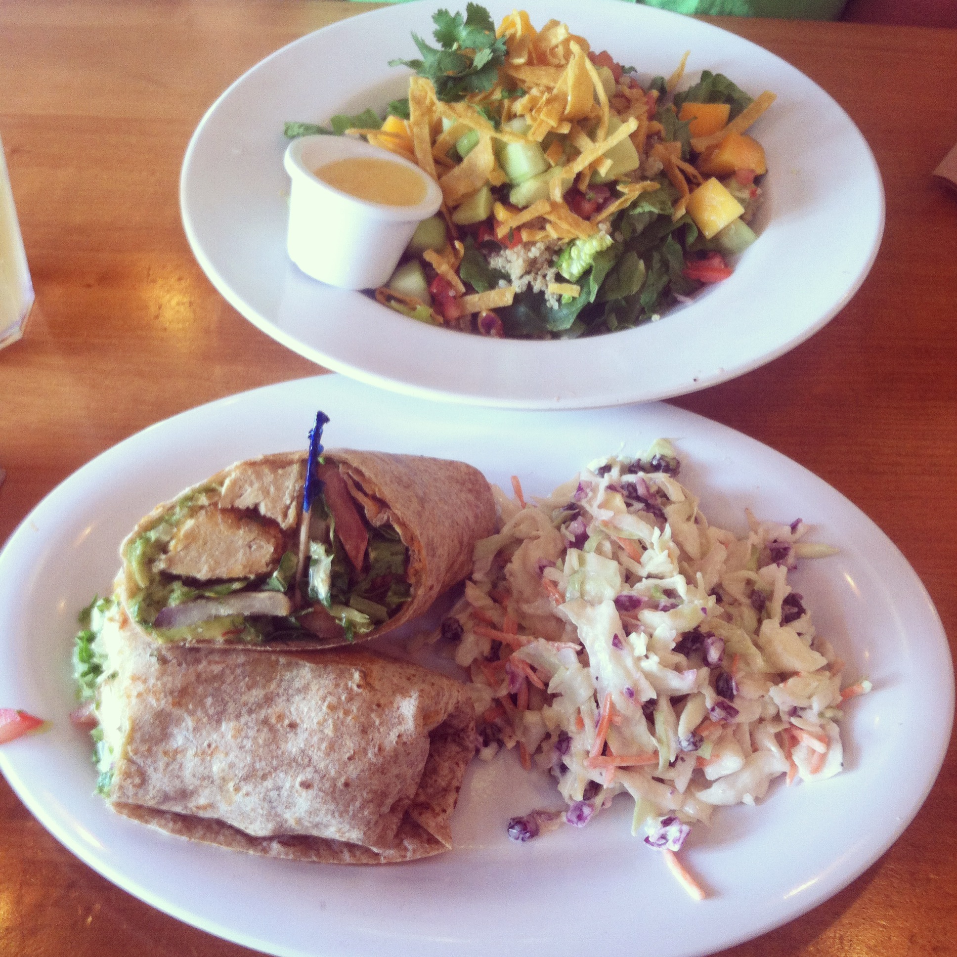 My mom got the Fiesta Salad with papaya, mango, spinach and quinoa (swoon.) Yeah, it totally blew her mind. It was soooo good and simple and just…ahhh. I ordered the spicy chicken sandwich as a wrap with spicy bbq ranch sauce and avocado and a side of coleslaw. It was so delicious that I made my picky eater, anit-vegan cousin taste it and he tried to eat the whole thing.