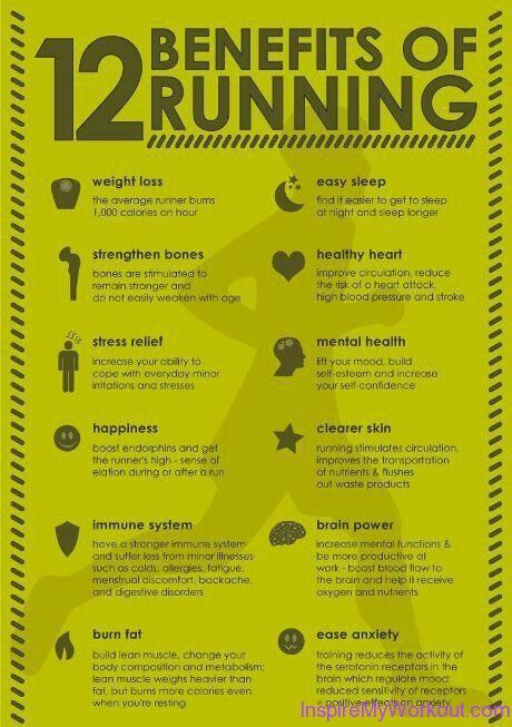 According to sources like Livestrong, Acitve.com and Women’s Health, running touts plentiful physical pro’s. Naturally, running does torch some calories (about 100/mile for a 150 lb. person) and builds up lean muscle mass, which spikes your resting metabolic rate. The more muscle mass you have, the more you burn when you’re not working out – even when you’re sleeping!