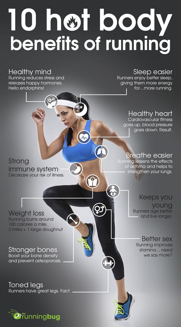 Racking up a few miles is a great tool for weight loss, plus it improves your physical health on several over fronts. It can boost good cholesterol and immune system function, improve lung function, and slash your risk of having a stroke, developing blood clots, and developing breast cancer in women. Hitting the pavement also strengthens and helps the heart’s elasticity, reducing the risk of heart attack.