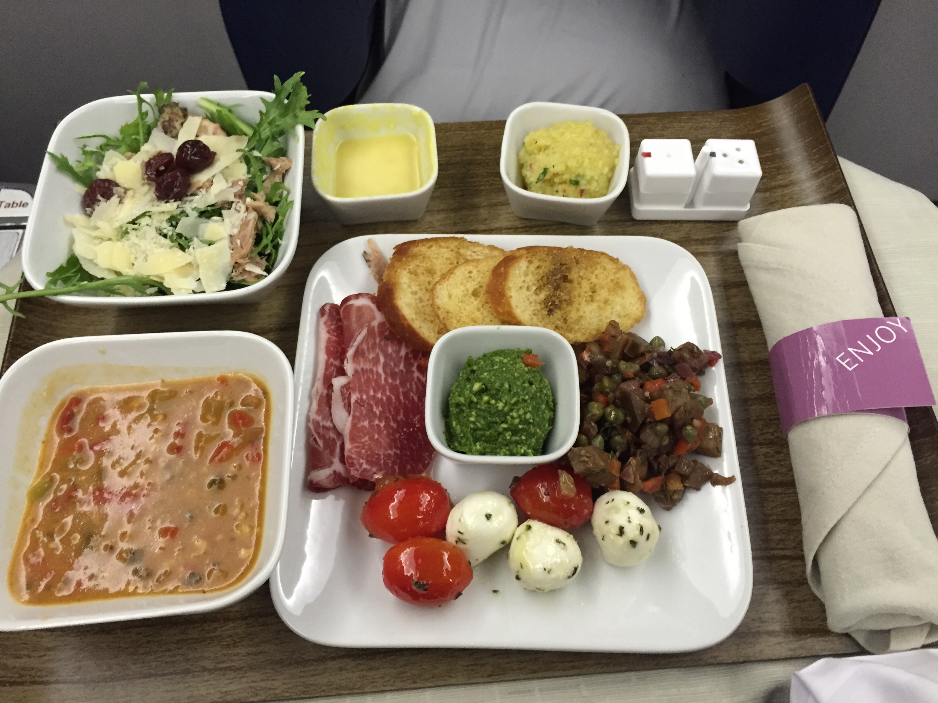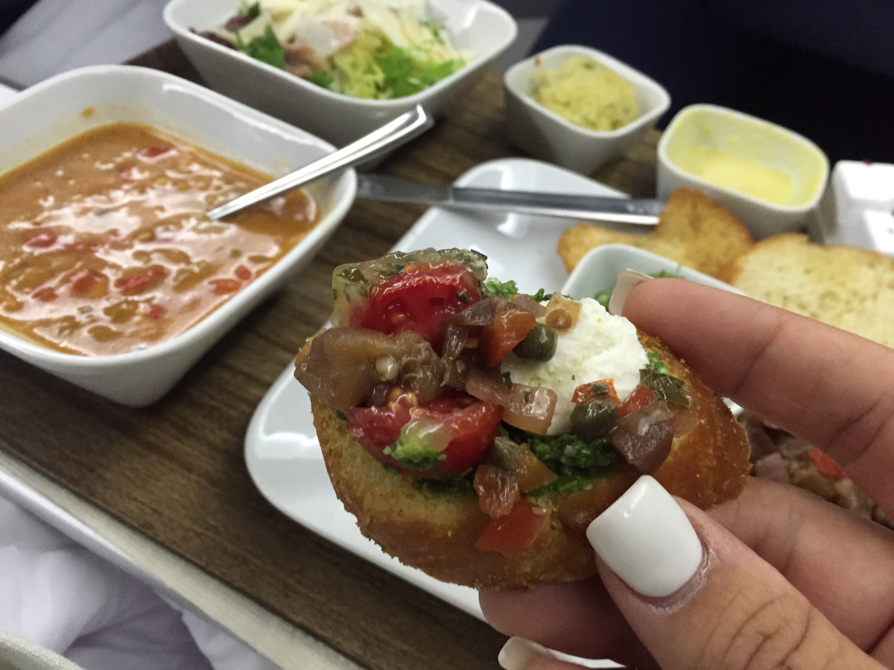 My Dad, sister & I just touched down in London, England. We snagged a direct flight from LA and got bumped up to first! We got so lucky to chow down in first class – and they even had plenty of veggie options!