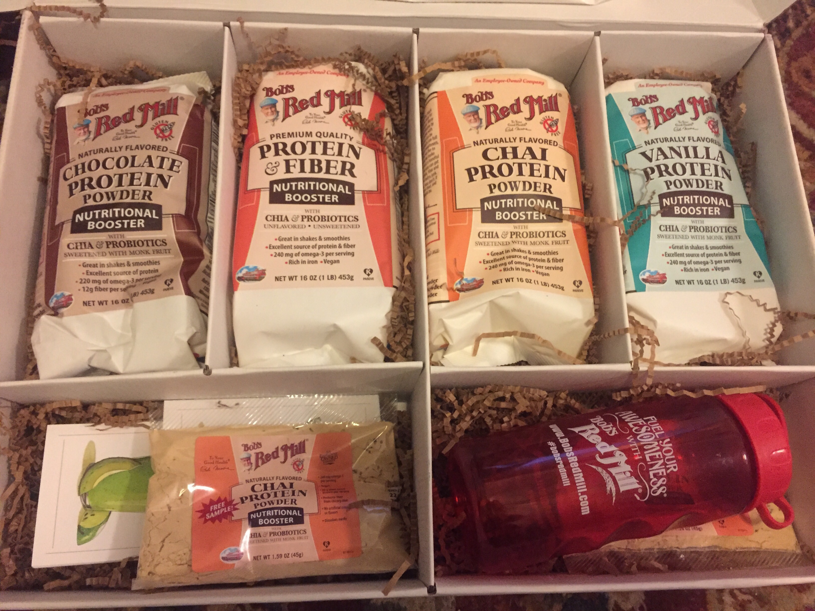 Let me just say – Bob’s Red Mill, you the real MVP. Y’all hooked it UP. I got four full-size flavors – Chocolate, Protein & Fiber, Vanilla, and, my very favorite, Chai – along with some recipes, sample/travel packs, and a super cute shaker bottle.