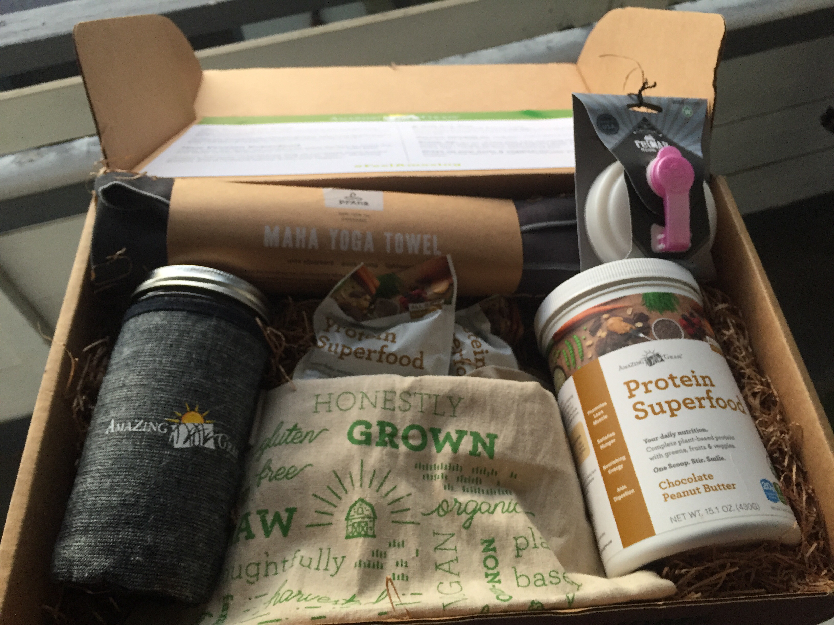 It had a full size tub of chocolate peanut butter protein powder, along with sample packs, a yoga towel (rad, right?!) a rucksack and the chicest protein shaker bottle I’ve ever seen – a mason jar with a protein too and a jar kid with a glass straw! 5 stars, two thumbs up, straight up awesomeness. Way to go, Amazing Grass!