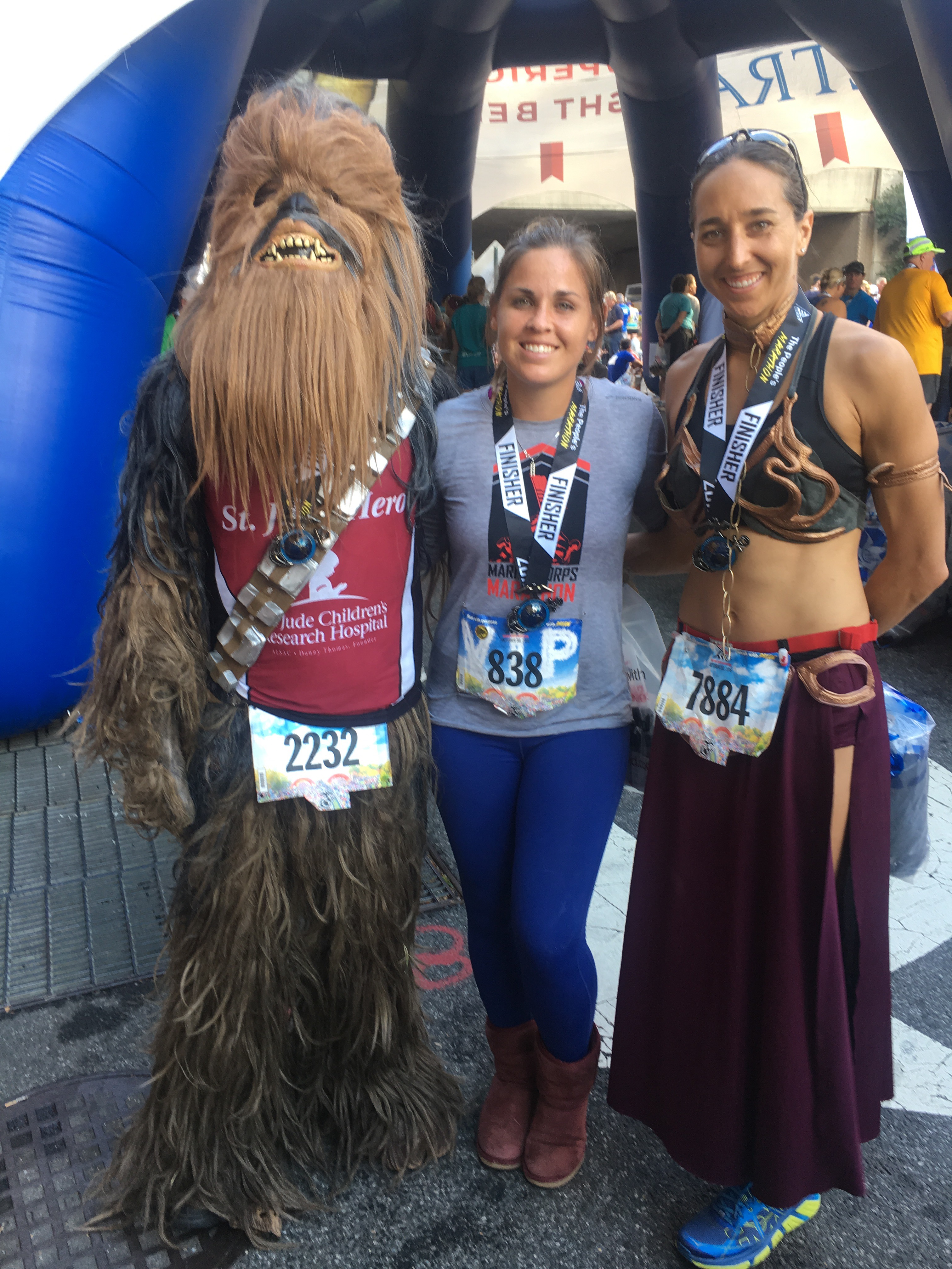 Despite my lack of training, the miles flew by quickly. The crowd was awesome as always, with especially riveting signs rooted in the craziness of the current election. There were rock and jazz bands, spectators in full costumes, and – best of ALL – a female firefighter running the entire marathon in her full gear. GIRL POWER, YEA!