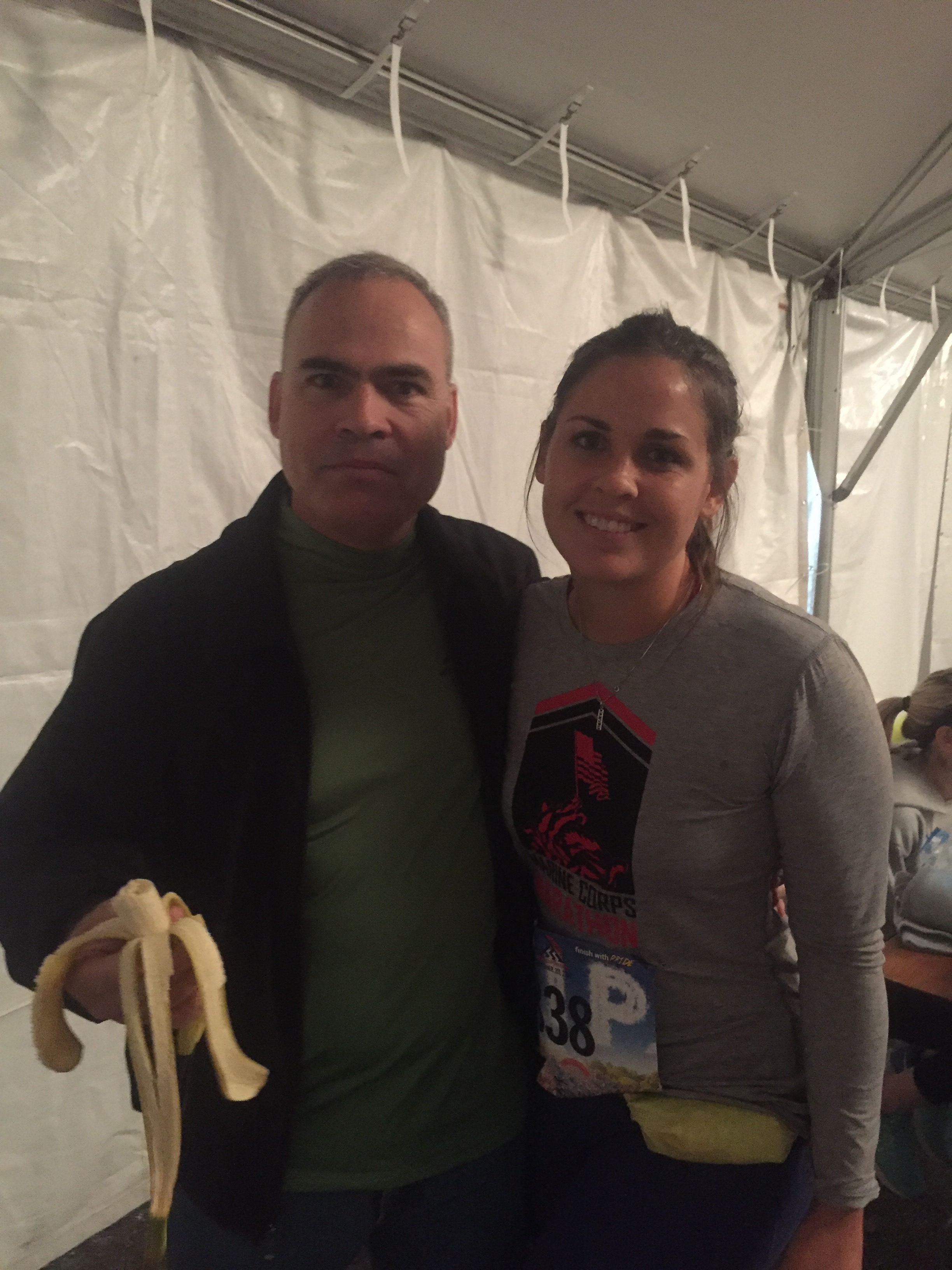 I hung out with my dad in the VIP runner tent for about an hour. The tent had a glorious buffet of energy gels, Clif Bars, bagels, cream cheese, bananas, apples and coffee. As in normal life, I stuck to banana, half a bagel, and some coffee to hold me over till the start.