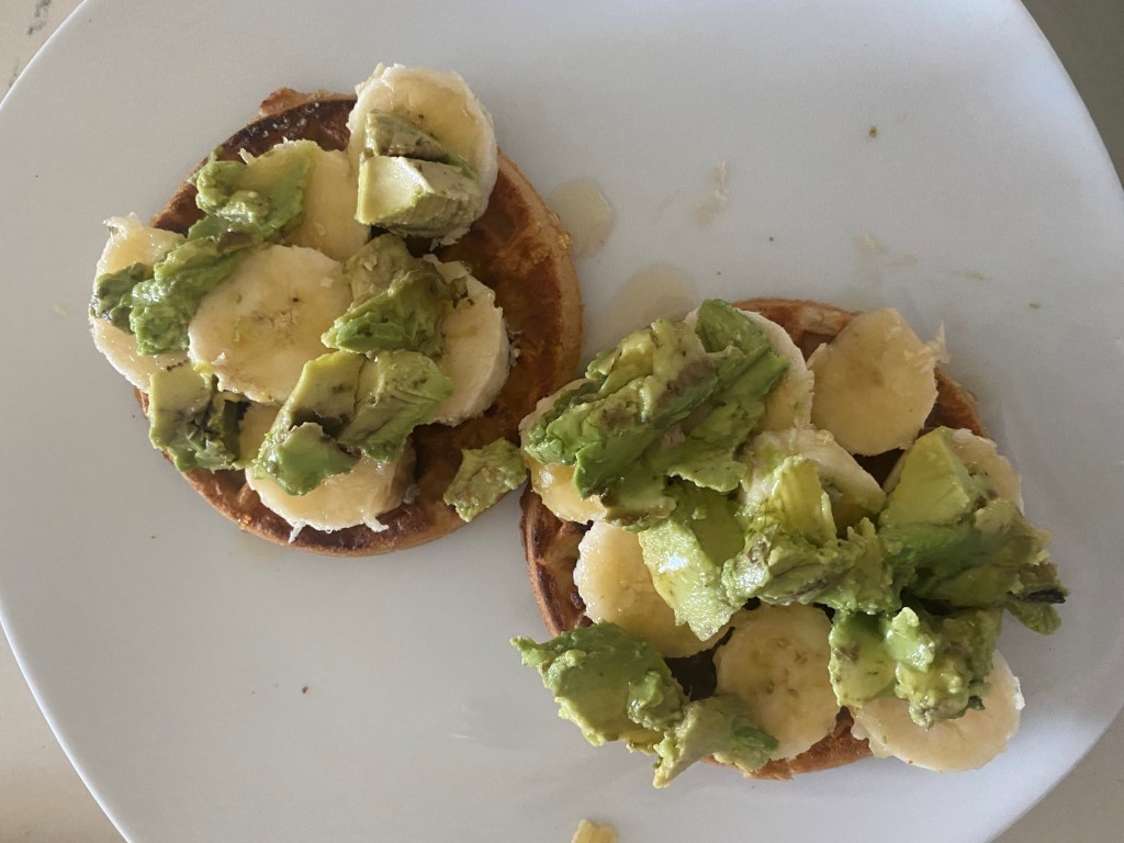 Waffles have been a constant craving, so I also started eating a more savory version with avocado and banana. The avocado adds a deeper texture and is great with a little lemon juice and salt on top.