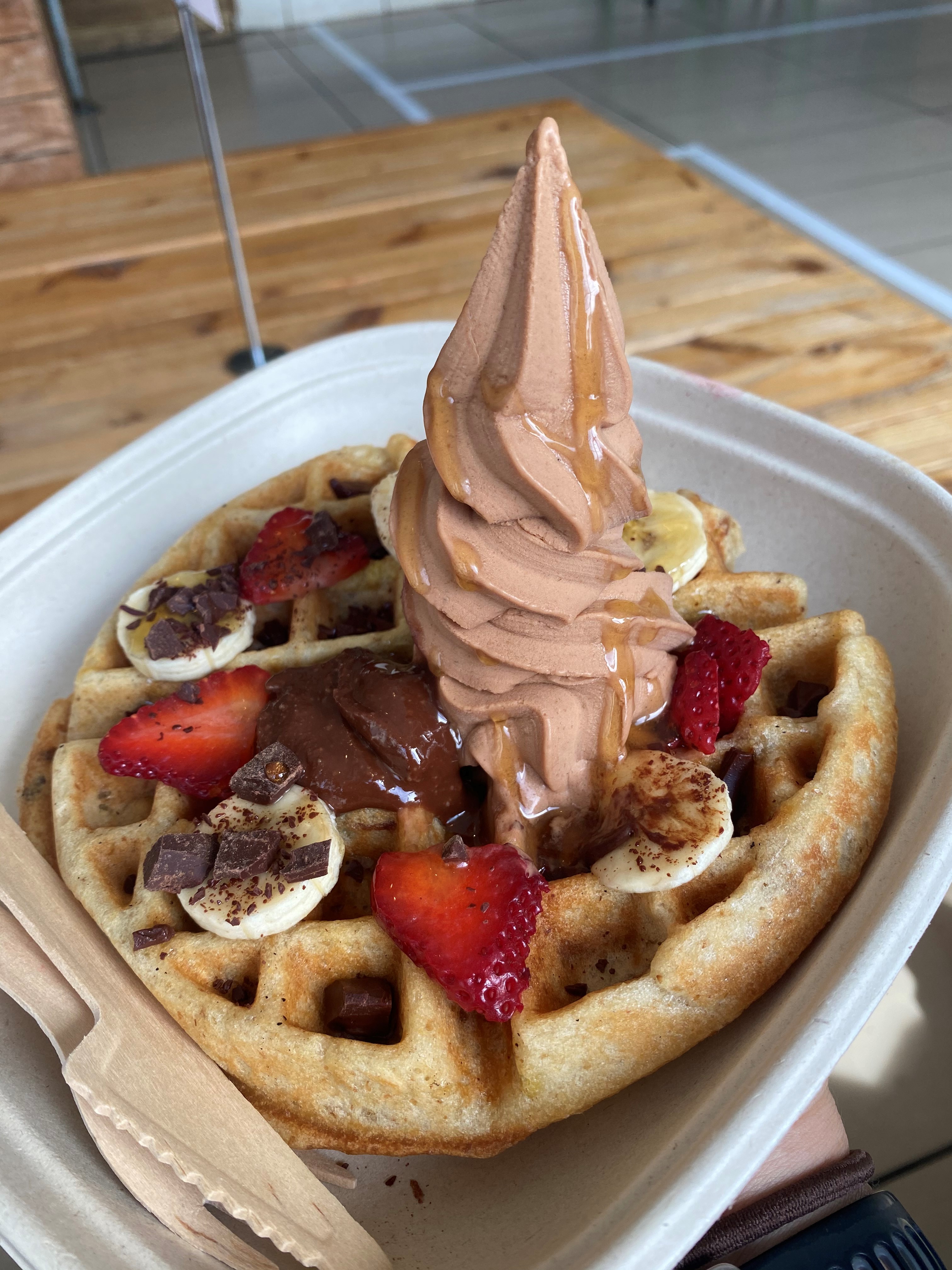 Here on Oahu, we are graced with the fruity magical-ness that is Banan. I am beyond obsessed. From their farm-to-table-to-farm business model (meaning the store’s food waste is composted and sent back to the local farms they get their produce from) to their ever-changing menu, it’s my favorite treat. Their ‘ice cream’ is made from super-sweet apple banans and topped with locally-produced guava, lilikoi, mac nut butter, macnella (macadamia-nutella, basically) and more. When they announced they had an ‘ulu (breadfruit) waffle, we had to run over there ASAP.